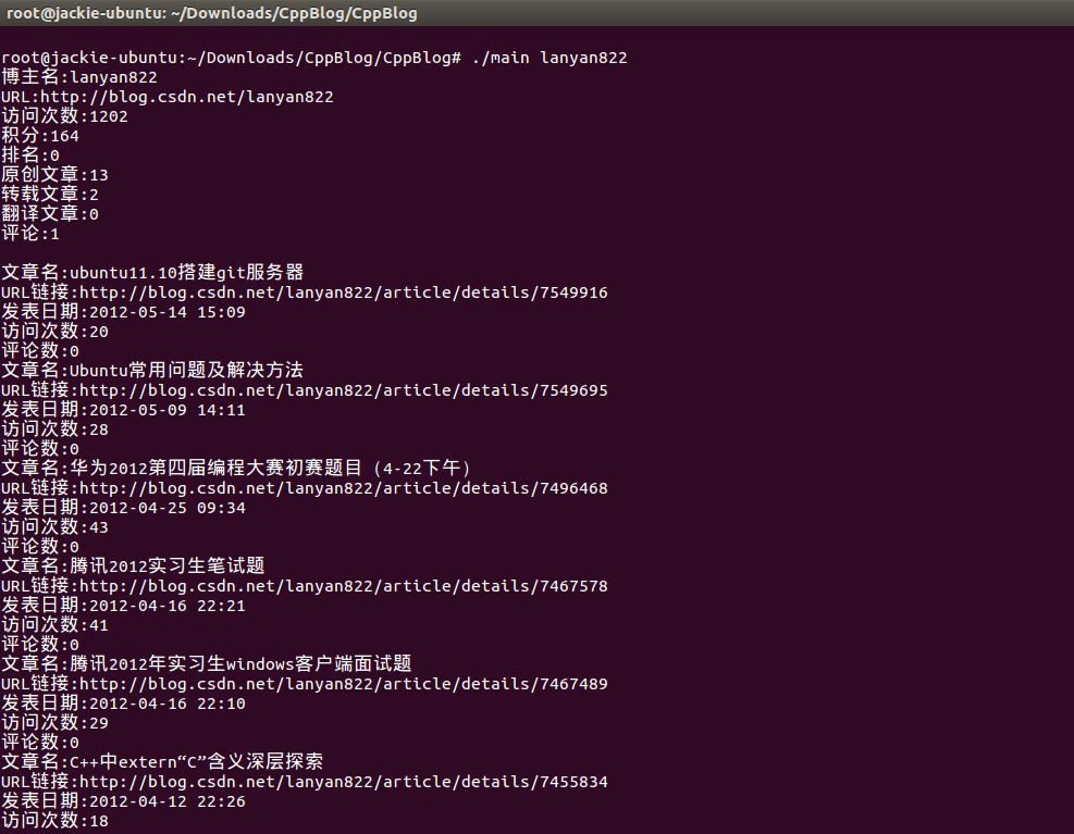 我主要解析了博客的文章名,文章URL,访问次数,排名,积分,原创文章数,转载文章数,翻译文章数,评论数。 源代码解析是按照所需要的信息在源代码中出现的顺序依次解析,先出现文章名,接着是文章的评论,发表日期等信息,接着解析博主的积分,等级等,***解析博主发表的文章数。 解析用的最多的是strstr函数。 [cpp] view plaincopyprint?函数功能:查找needle在haystack中***次出现的地址,查找成功,返回***次出现的地址,查找失败返回0.类似于c++ string的find_first_of函数。 信息解析出来,需要存储下来。主要是存在自定义的数据结构里面。每一页(最多50篇文章)存储在struct Articles结构体里面,文章信息则存入struct ArticleInfo里面。页面存储结构如下图所示:
