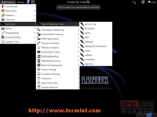 Kali Linux是Debian的一款衍生版。Kali旨在用于渗透测试。它大概在三个月前才发行。Kali的前身是Backtrack。用于Debian的所有Binary软件包都可以安装到Kali Linux上,而Kali的魅力或威力就来自于此。此外,支持Debian的用户论坛为Kali加分不少。Kali随带许多的渗透测试工具,无论是Wifi、数据库还是其他任何工具,都设计成立马可以使用。Kali使用APT来管理软件包。