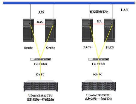 在这样的思路下,联创信安为泰和医院打造了统一存储解决方案,用2套统一存储系统 UDsafe ESS630TU分别作为无线DB和PACS系统的存储系统使用。方案不仅实现了泰和医院无线DB/PACS应用的数据安全和高效存取,还利用成熟高效Active-Active的双控设计,确保了无线DB/PACS应用数据库7*24小时不间断运行。