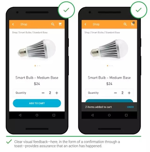 当用户将商品添加到购物车中或提交订单时,缺乏视觉反馈效果可能会导致用户质疑该操作是否已被处理。提供视觉动画或其他类型的视效即可消除用户的猜疑。