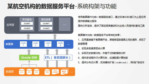 2、某航空机构的数据服务平台。帮其实现了数据仓库数据和外部数据混合计算,使其对内部部门、对外部客户都可以提供很好的数据服务。(下图是系统构架与功能)