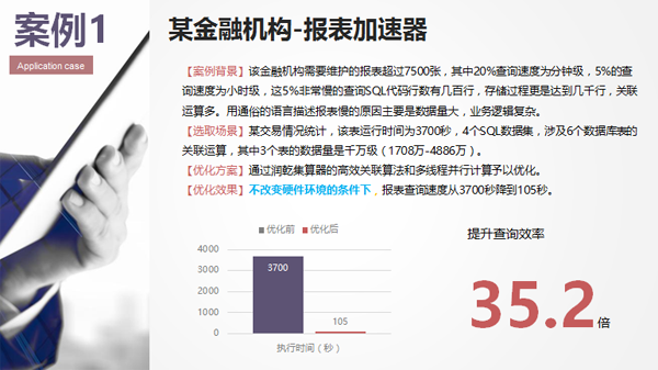 1、某金融机构报表提速。典型的“润乾创新计算引擎-集算器”在报表加速器场景的应用,在不改变硬件的前提下,提升查询速度35.2倍。(详细介绍见下图)