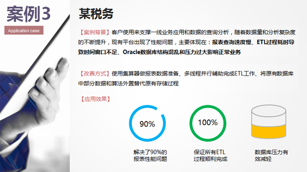 3、某税务机构的性能提升。使用集算器做报表数据准备、多线程并行辅助完成ETL工作、将原有数据库中部分数据和算法外置替代原有存储过程。解决90%报表性能问题,保证ETL工作,为数据库减压。(详细介绍见下图)