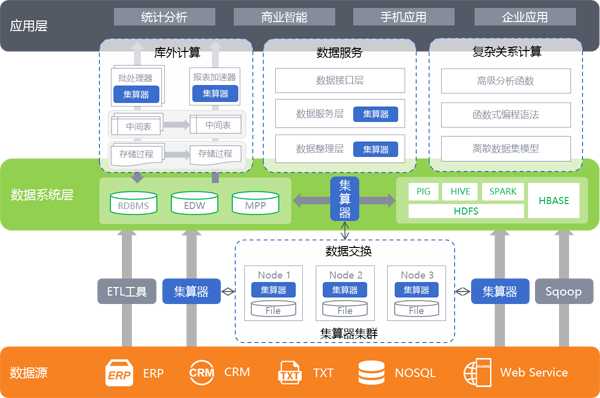 集算器填补了这一空白,集算器支持集群运算,其设计目标就是面向中小集群规模,维管成本能大幅降低且能更有效地利用有限资源。