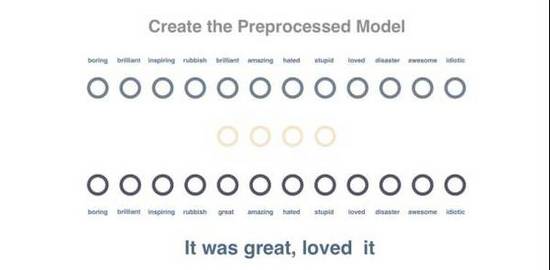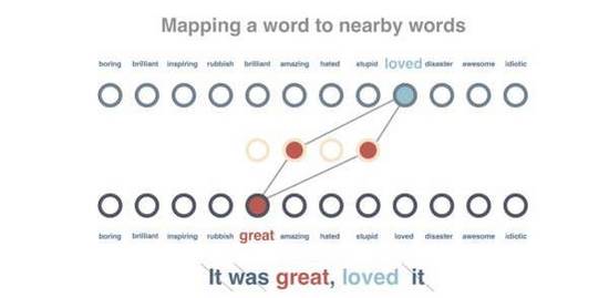 我们继续对这个图表进行训练,让相同上下文中出现的词语可以获得类似的向量表征。我们会对这些句子进行预处理,移除所有停用词(Stop word)并实现标记化(Tokenizing)。随后一次传递一个词语,尽量缩短该词语向量与周边词语之间的距离,并扩大与上下文不包含的随机词语之间的距离。