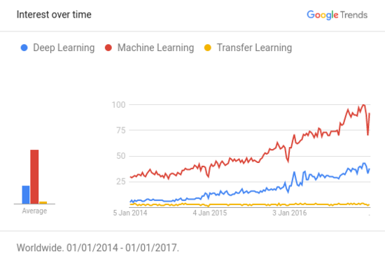 谷歌搜索中,机器学习、深度学习,以及迁移学习三个关键字的搜索趋势变化