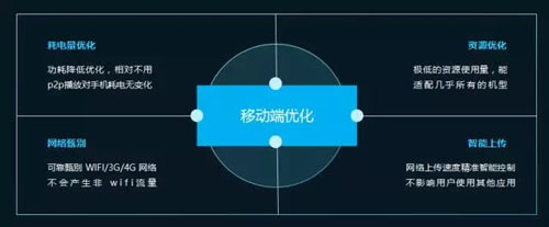 云帆加速较于其他公司,技术团队自带流媒体技术基因,拥有着长达7年的P2P技术积累,加之经历过快播过亿用户的考验。而且早在快播时代,P2P技术就已经是国内***的了,并通过P4P功能避免了传统P2P吞噬带宽影响用户使用其他应用的体验。在移动互联网崛起中,云帆加速也从耗电量、资源、网络甄别和上传四个方面对移动端进行了优化,如下图: