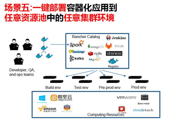 五是复杂 It 环境一键部署。对于一键部署,Rancher强调要把一键部署容器化的应用到任何资源池的任何集群环境。过去,企业里不同的人员扮演着不同的角色,例如一部分人是系统管理人员,一部分是运维人员,一部分是开发人员。如何利用DevOps来实现快速部署呢?例如一个人要把复杂的应用部署到任何一个地方,想用亚马逊就安装亚马逊,想用阿里云就安装阿里云,想用自己的数据中心物理机、虚拟机都可以,只要在Rancher上点一下,即能够部署好,大大降低了部署的难度,提高了部署所用的时间。