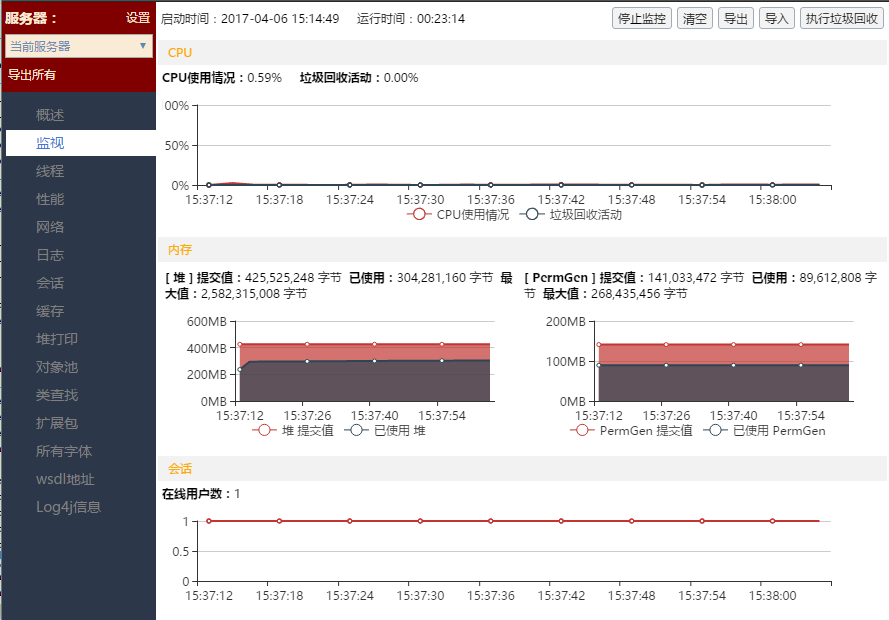 2、 自动监控。系统启动后默认会自动开始监控服务器端。开始监控后,服务器端默认每隔2秒记录一下当前的CPU和内存使用情况、服务器在线用户数,让用户界面化监控服务器运行情况,防患于未然。