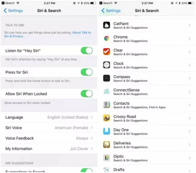 在设置应用中,将Siri和Search条目进行了整合,更加符合人性化操作。在这里用户还针对每个应用进行相关的SIri设置。
