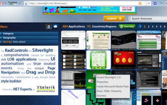访问Silverlight官方站炫耀栏目:http://silverlight.net/Showcase/,炫耀各个单元表现完美(如图),下图中可以看到Moonlight的菜单:
