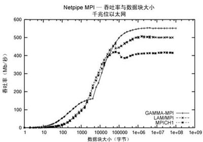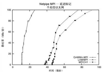 此样图取自使用3个不同MPI库的GigE网络。从此图中,您可以测量带宽(图中***值的一半)和N/2(***实现***带宽时的数据包大小(单位:字节))。