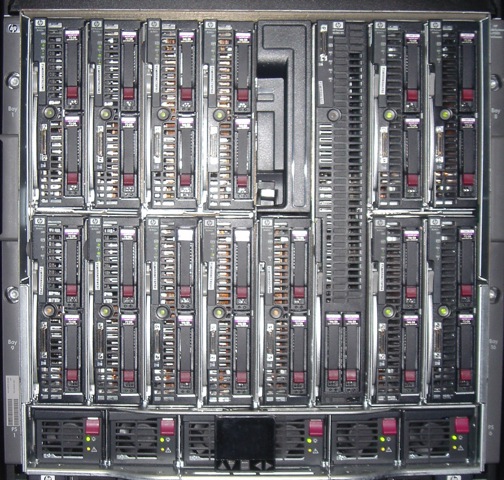 在上图中,是一台惠普的C7000机箱。请注意最右边的插槽。我们在一个机架上安置了4台半高的刀片服务器。这4台组成了一个机架单元。在该机架的左边,我们有一台全高度的刀片服务器,紧靠着底部的一台半高刀片服务器,右上方还有一个空余单元。这一组服务器也组成了一个机架单元:全高插槽及其紧邻位置的插槽都有相同的机架设置。这意味着我可以安装两台全高刀片服务器,或一台全高与两台半高服务器。