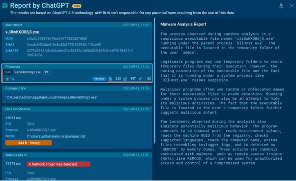 上图展示的是由ANY.RUN检测到的、借助人工智能生成的针对恶意进程的报告。凭借它,您可以全面地了解恶意软件执行某项活动的方式和原因,以及它对于基础架构安全性的影响。