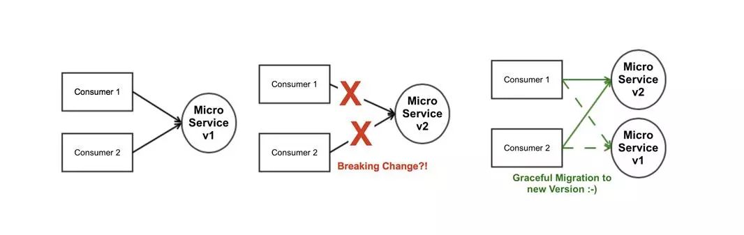 随着微服务世界所期望的服务数量的增长,复杂性也在增长。有一个版本控制策略,可以让消费者进行优雅的迁移,并确保提供商可以透明地部署更改,而不会影响任何人。限制生产中并排主要版本的数量并管理它们。