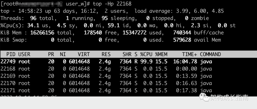 执行top命令,查看是哪个进程导致的,可以确定是pid为22168的java应用导致的: