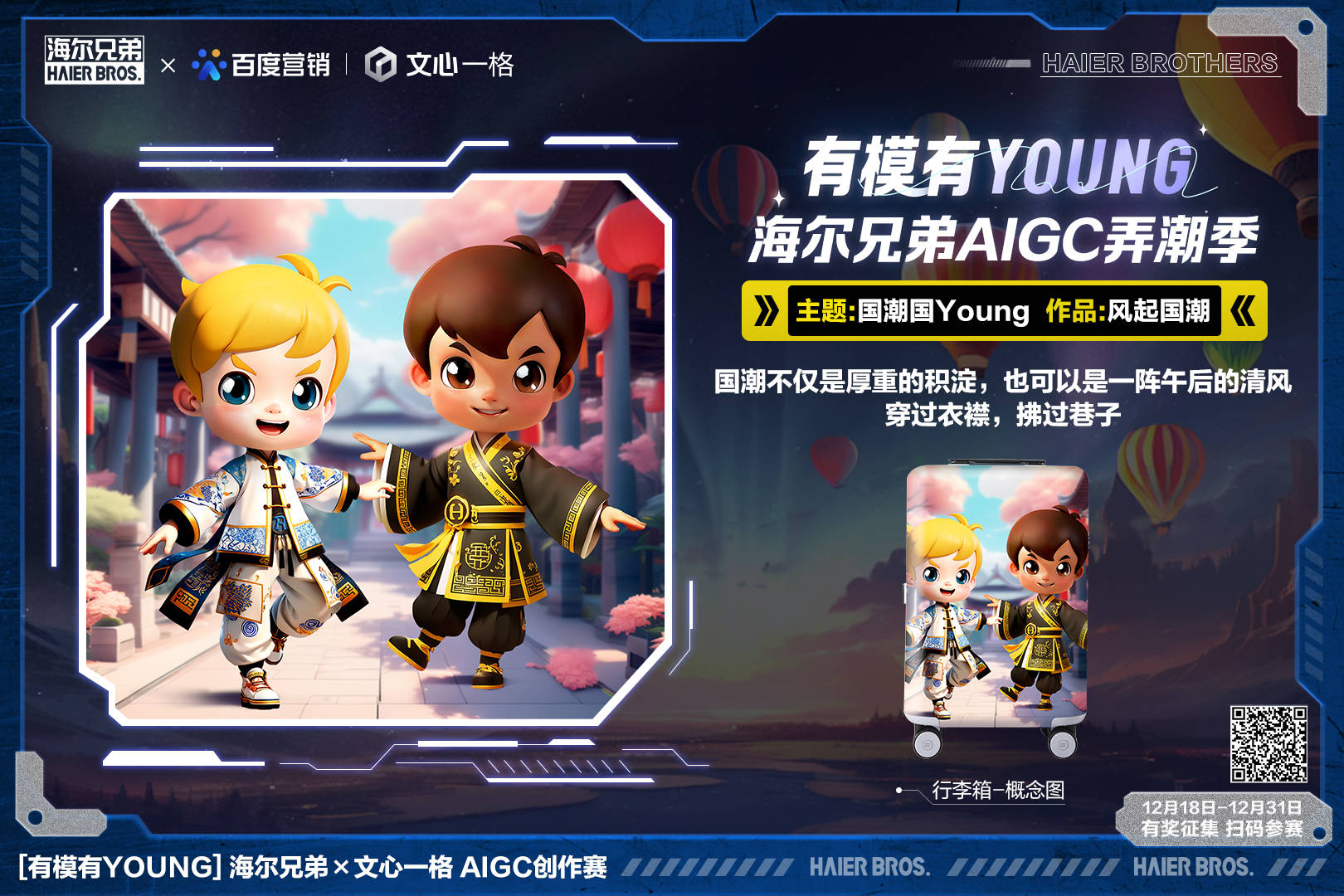 无界想象,无限探索!当国民IP遇上AI先锋,用AI画笔和想象力赋予海尔兄弟全新模样。本次AI创作大赛设定星辰大海、雷欧派对、国潮三大主题,给予每一位参赛者充足的想象空间。当海尔兄弟成为冒险家征战星辰大海,当海尔兄弟玩转雷欧派对,当海尔兄弟穿上国潮服饰,一场科技与回忆的碰撞,必将擦出精彩火花。