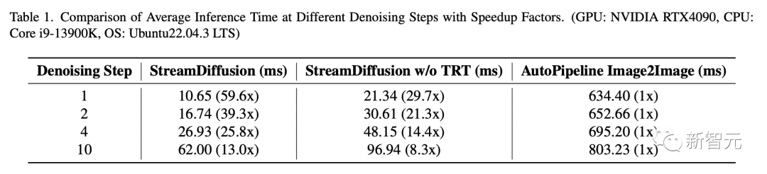 当使用TensorRT时,StreamDiffusion在运行10个去噪步骤时,实现了13倍的速度提升。而在涉及单个去噪步骤的情况下,速度提升可达59.6倍。