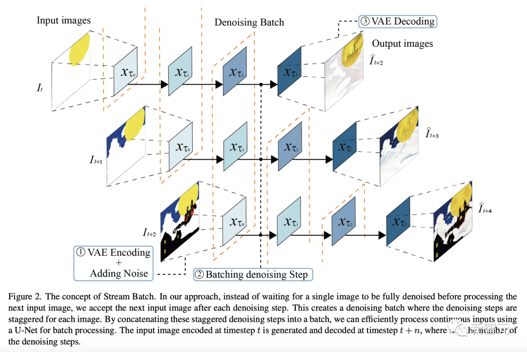如下图所示,在最新的方法中,在处理下一个输入图像之前,不会等待单个图像完全去噪,而是在每个去噪步骤后接受下一个输入图像。