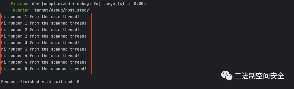 }注意当 Rust 程序的主线程结束时,新线程也会结束,而不管其是否执行完毕。这个程序的输出可能每次都略有不同,不过它大体上看起来像这样: