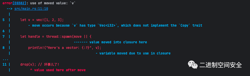 }如果 Rust 允许这段代码运行,则新建线程则可能会立刻被转移到后台并完全没有机会运行。新建线程内部有一个 v 的引用,不过主线程立刻就使用drop丢弃了v。接着当新建线程开始执行,v 已不再有效,所以其引用也是无效的。