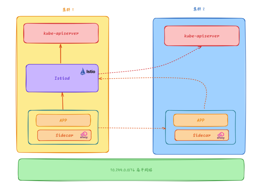 该模型下只需要将 Istio 控制面组件部署在主集群中,然后可以通过这个控制面来管理所有集群的 Service 和 Endpoint,其他的 Istio 相关的 API 比如 VirtualService、DestinationRule 等也只需要在主集群中配置即可,其他集群不需要部署 Istio 控制面组件。