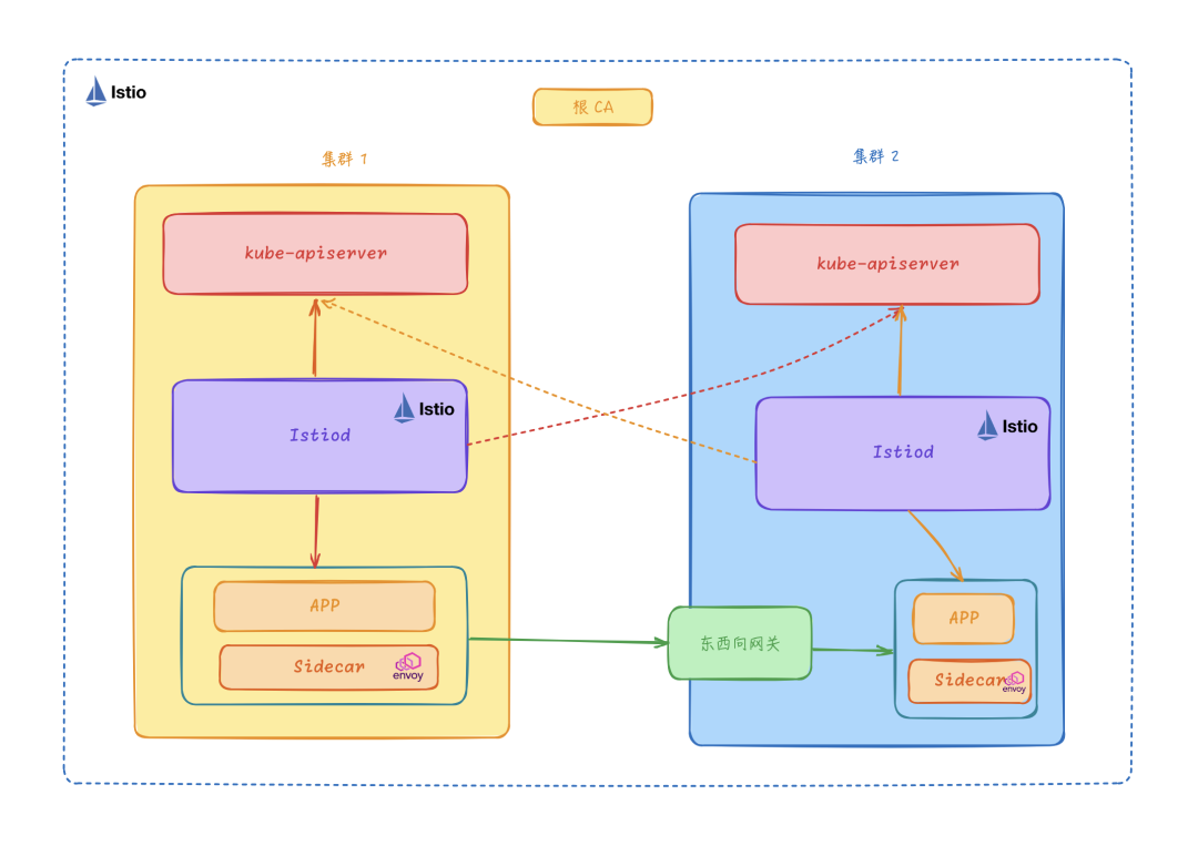 控制平面的 Istiod 核心组件负责连接所有集群的 kube-apiserver,获取每个集群的 Service、Endpoint、Pod 等信息,所有集群的 Sidecar 均连接到这个中心控制面,由这个中心控制面负责所有的 Envoy Sidecar 的配置生成和分发。