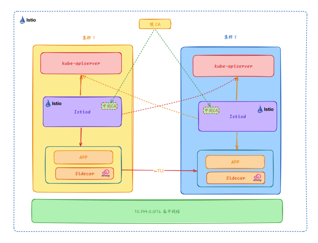 多集群扁平网络模型和单一集群的服务网格在访问方式上几乎没什么区别,但是需要注意不同集群的 Service IP 和 Pod 的 IP 不能重叠,否则会导致集群之间的服务发现出现问题,这也是扁平网络模型的一个缺点,需要提前规划好集群的网段。