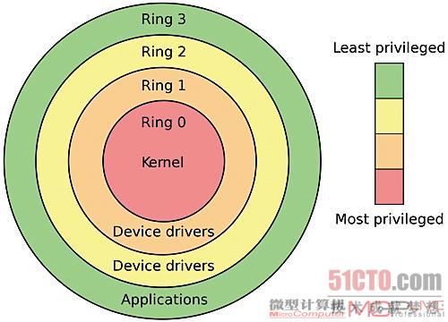 大部分的现代计算机体系结构都有两个或两个以上的特权级别,用来分隔内核和应用软件。以x86为例,为了得到更高的保护控制,在x86的保护模式下定义了当前特权级别(Current Previleged Level,简称CPL),一共有四个特级层次(0 to 3)被定义,我们一般称之为Ring。Ring后面的数字越大特权越小,我们的操作系统一般都运行在Ring0上,而Ring1和2一般用来支持设备驱动,Ring3上面跑的就是应用软件了。而在现在的x86处理器中,64位架构已经非常普遍,64位CPU因为必须支持页表模式,所以只有两个特权级别,我们可以简单理解为Ring0和Ring3(实际上另有明确定义),这种模型我们常称为0/3模型。
