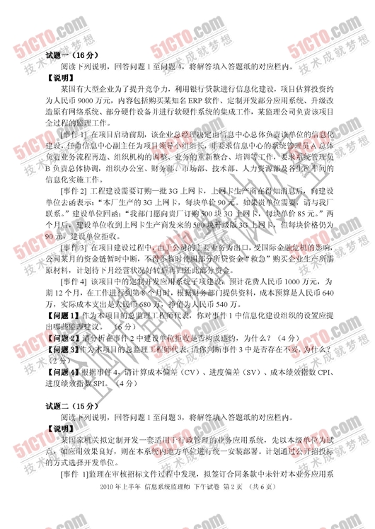 2010年上半年全国信息系统监理师考试在5月22日举行,以下为信息系统监理师具体试题。51CTO.com稍后将公布2010年上半年软考试题和专家版答案、点评,敬请关注。51CTO软考专区:http://training.51cto.com/softexam/