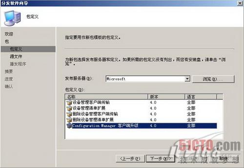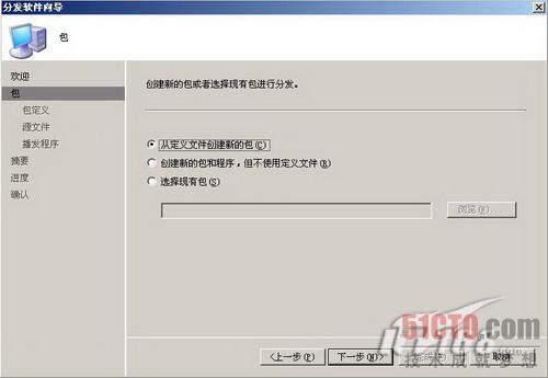接下来我们要为安装Windows7的裸机准备一个客户端升级程序,让裸机在安装完Windows7后可以继续安装最新的SCCM客户端。在SCCM管理控制台上定位到软件分发下的包,选择分发软件。如图11所示,在分发软件向导中选择"从定义文件创建新的包"。