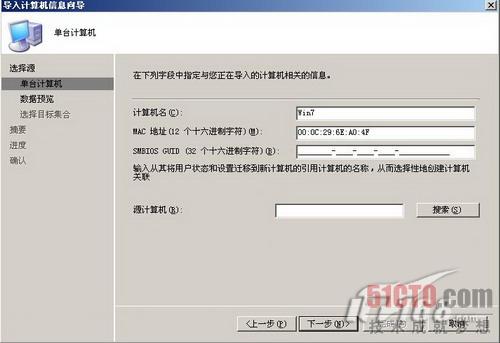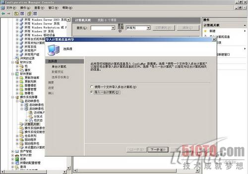 我们还需要把安装Windows7的裸机信息导入到SCCM服务器上,其实就是把裸机的MAC地址在SCCM服务器上进行登记。在SCCM服务器的管理控制台上定位到操作系统部署下的计算机关联,如图6所示,我们准备导入一台计算机。