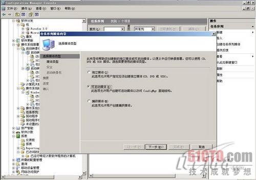 在裸机上部署Windows7,我们可以通过PXE网卡引导裸机,也可以通过引导光盘启动裸机,本次为大家介绍如何通过引导光盘安装Windows7。在SCCM管理控制台上右键点击任务序列,选择"创建任务序列媒体"。如图29所示,选择创建"可启动媒体"。