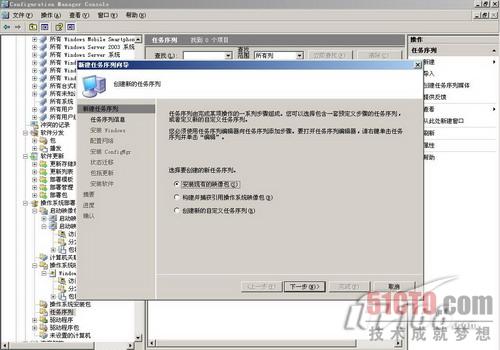 做完前面的准备工作后,我们可以创建任务序列了,通过任务序列,我们可以把操作系统部署过程中所要做的工作都预先定义出来。在SCCM管理控制台上打开操作系统部署下的任务序列,如图17所示,选择创建一个新的任务序列,在任务序列中要安装现有的映像包。