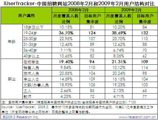 艾瑞iUserTracker***数据显示,与去年同期相比,2009年2月招聘网站中19-24岁用户所占比例有所上升,目标用户集中度也显著提高;同样,在校学生的目标用户集中度也从94上升至109。
