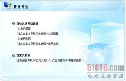 相对于C/S架构的网络拓扑,无需安装客户端,从任何一点都可以登录访问,***进入界面后,有使用快速使用向导,引导用户进行发现配置/全网发现,或新建自定义拓扑。