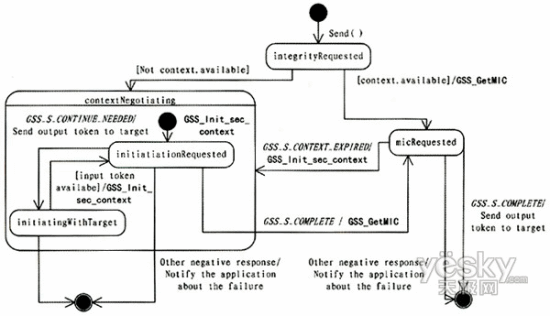 下面说明如何利用GSS-API实现保证通信完整性的安全能力抽象类,通过状态图说明保证通信完整性的Sender类的send()方法及Receiver类的receive()方法的GSS-API实现。本文中给出的是一个示意性的说明,忽略了一些错误处理过程。