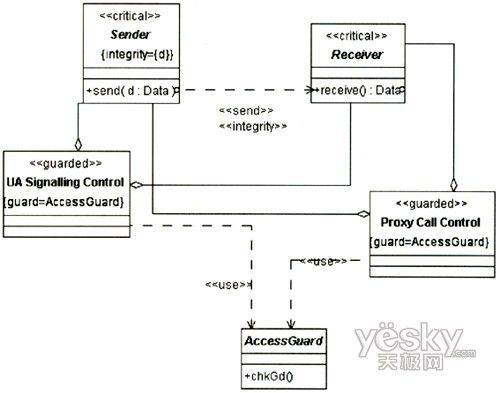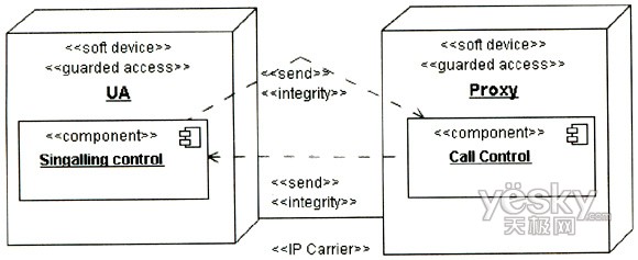 图3中的UA代表UserA或UserB的UA,因为两个UA的信令交互需要通过Proxy,且其安全需求是一致的,故在图中只表现出一方。UA和Proxy均是基于通用计算平台的节点,其访问控制需要受到保护,故对其标记上定型《guardedaccess》。UA中除处理信令外,还需处理媒体流的编解码与控制,这个用例中只涉及信令的安全性,故在UA中只关注进行信令控制的组件。UA与Proxy之间的通信基于IP承载,根据表1定义的威胁函数:ThreatA(IP Carrier)={delete,read,insert},信令的完整性在攻击下可能遭到破坏,需要采用相应的安全机制对信令交互加以保护。