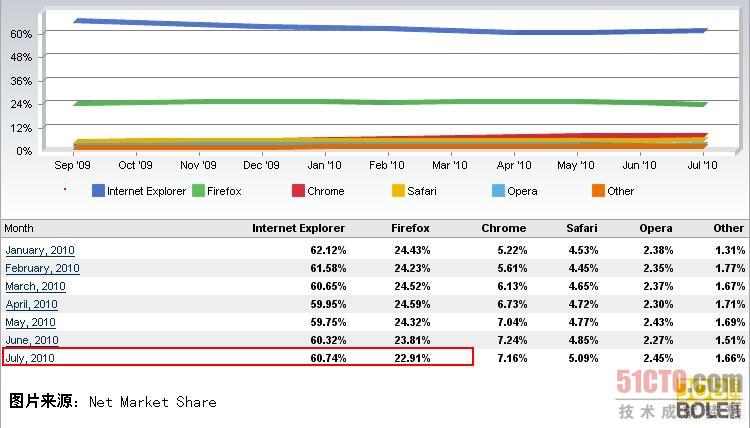 根据Net Market Share 2010年7月份***统计,Firefox市场占有率为22.91%,IE为60.74%。