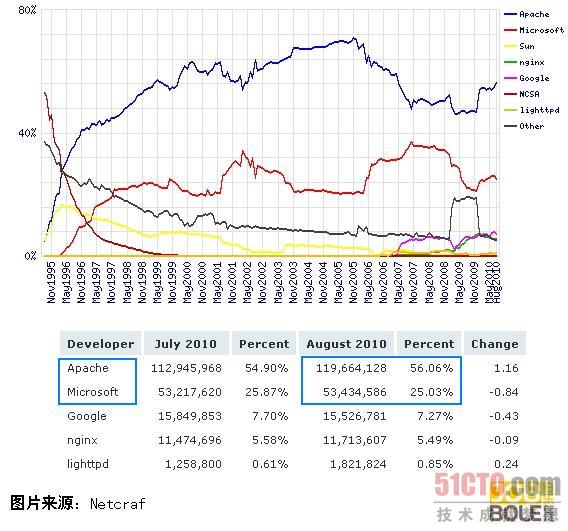 据Netcraft2010年8月11日的数据统计表明,全球目前已有119,664,128个网站使用Apache;目前Apache市场占有率为54.90%,IIS为25.87%。