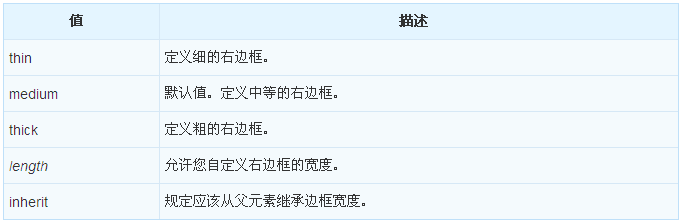 注释:请始终在 border-right-width 属性之前声明 border-style 属性。元素只有在获得边框之后,才能改变其边框的宽度。
