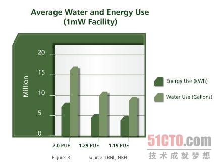 为了了解数据中心耗水问题的程度,考虑以下情况。如果你有一个典型的电源使用效率(PUE)为2.0、等级在1mW的设施,传统思维假定水的使用将仅限于加湿器和暖通及空调(HVAC)设备。这些假设是存在严重缺陷的。一个1mW的设施每年使用在电厂的17,520,000加仑的水。如果这一设施的PUE改善为1.29,那么,水的使用可以减少到每年11,300,400加仑左右。一个PUE为1.19的设施会减少这种消费到每年10,424,400加仑。这些指标不是一厢情愿的产物。最近,Google展示了PUE为1.25的更为节水的设施;财富数据中心(Fortune Data Centers)刚刚完成了PUE为1.38的更为节水的设施;Sonic.net,加利福尼亚州Santa Rosa的一个ISP和地方供应商的合资公司,最近完成了设施改造,完成了一个PUE接近1.29的制冷剂方面节约系统。虽然这些效率水平令人印象深刻,但是,一些业内专家认为,在不损害任何的环境标准的情况下,获得PUE为1.18至1.19的设施是非常有可能。见图3。