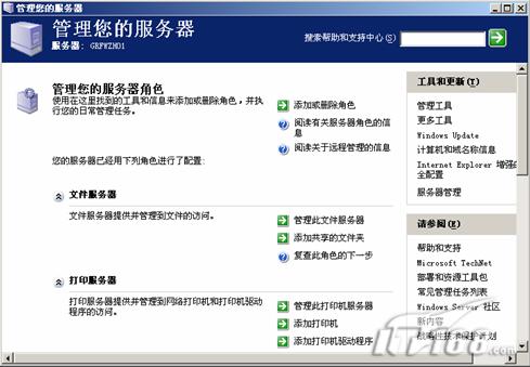 (1)执行【开始】→【管理工具】→【管理您的服务器】桌面菜单操作,打开如图1所示窗口。