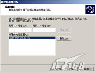 (8)单击“下一步”按钮,打开如图9所示对话框。在这个对话框中要求指定要排除的IP地址。排除的IP地址就是不用于自动分配的IP地址。这在一个子网中,通常域控制器的IP地址是要静态配置的,而且通常采用子网中第一个可用IP地址,所以在此只排除第一个IP地址192.168.0.129(如果有其它服务器要采用静态IP地址,则也需排除在外,否则会引起IP地址冲突)。