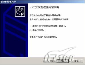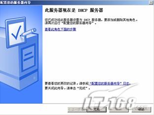 (11)单击“下一步”按钮,打开如图12所示对话框,完成“新建作用域”向导。单击“完成”按钮后返回到“管理您的服务器向导”对话框。随后系统即弹出如图13所示向导完成对话框。单击“完成”按钮即完成DHCP服务器角色配置了。