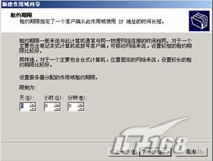 (9)单击“下一步”按钮,打开如图10所示对话框。在这个对话框中要求指定这些IP地址一次使用的期限。通常不用配置,当然如果这台服务器是为那些临时用户而配置,则可在此限制他们的使用时间。