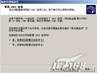 (10)单击“下一步”按钮,打开如图11所示对话框。在这个对话框中要求选择是否现在就为DHCP选项。因为这些选项在SALES子网中基本无需配置,所以在此选择“否,我想稍后配置这些选项”单选项。