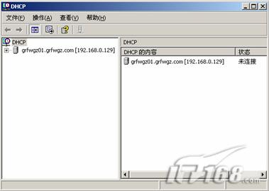 (13)双击相应DHCP服务器(本例为grfwgz01.grfwgz.com),展开控制台树,然后在相应作用域上单击右键,在弹出菜单中选择“激活”选项。此时DHCP服务器即显“活动”状态了,如图15所示。