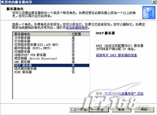 (3)单击“下一步”按钮,打开如图3所示对话框。在这个对话框列表中显示当前服务器中各角色的配置情况,找到“DHCP服务器”项,可以看到当前没有配置成DHCP服务器角色。