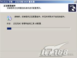 (5)直接单击“下一步”按钮,打开如图5所示对话框。这是个服务器安装组件的进程对话框。显示为了安装DHCP服务器所进行的组件安装进程。